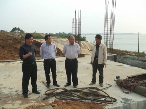 2012年4月,公司總經(jīng)理潘群芳(左二)陪同市水利局局長(zhǎng)胡經(jīng)緯(右二)檢查小河嘴進(jìn)水閘工地