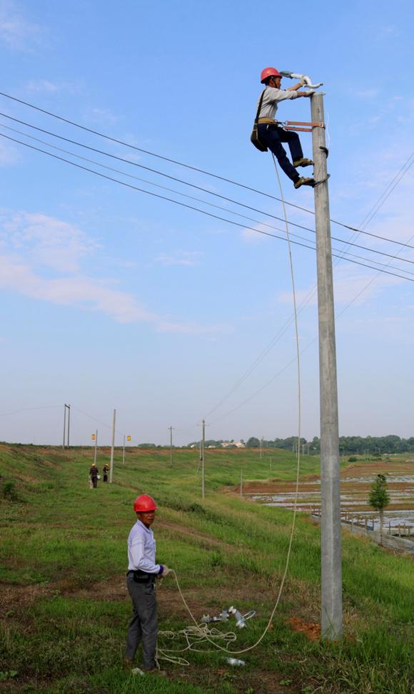 5月28日,在沅江市長春垸東線防洪大堤內(nèi)坡,幾名施工人員頂著烈日,爬電桿、拖電線、架設(shè)照明設(shè)備。